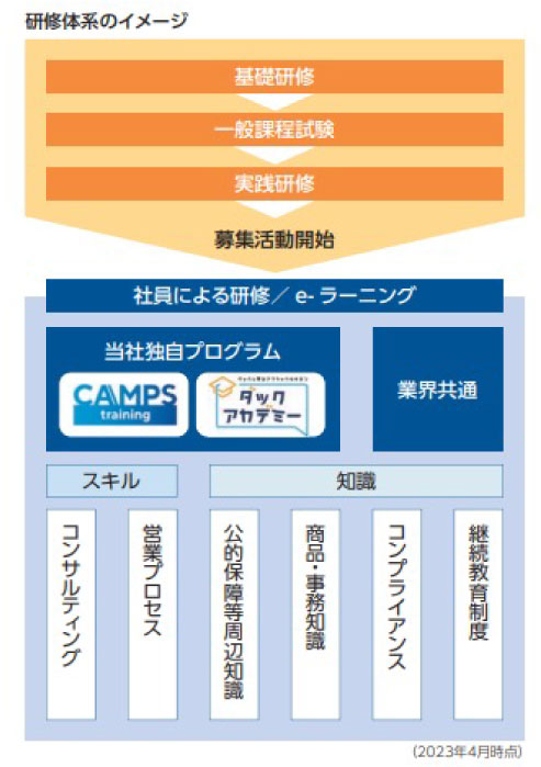 業界共通で求められる保険やコンプライアンスに関する知識に加え、コンサルティングスキルや公的保険制度、商品等の知識を習得するための当社独自プログラムを提供しています。